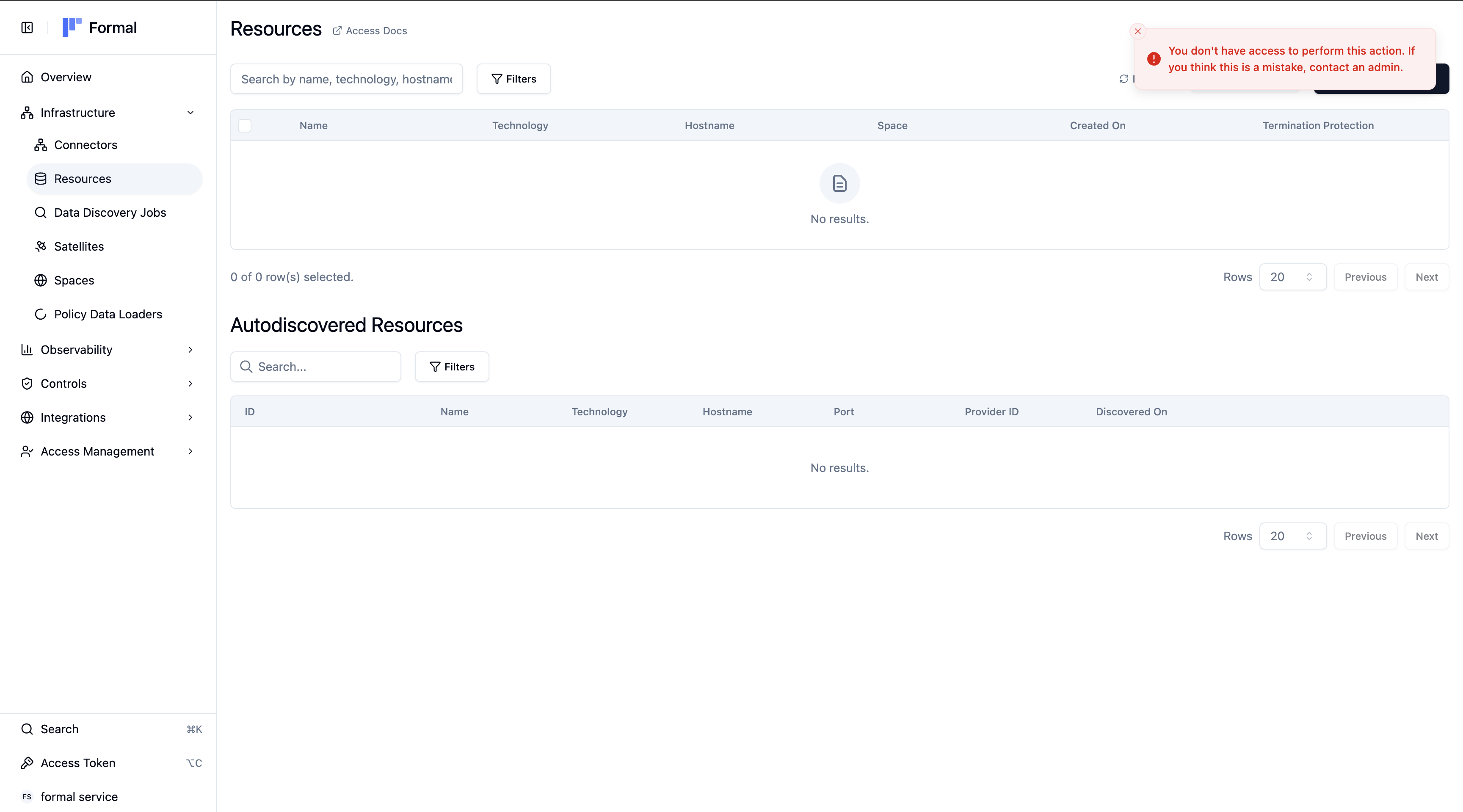 Unlike other software products, Formal does not have the traditional concept of Roles. Instead, users can leverage Permissions to create role based access control (RBAC) using your organization’s Groups (which can be SCIM provisioned from your IDP into Formal).User experience when blocked