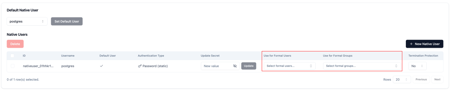 If Formal credentials are passed at connection time, the Connector will deetermine the relevant native user using the Formal identity. Specify which native user to use via the control plane or via Terraform.Specify the Native User at Connection Time
