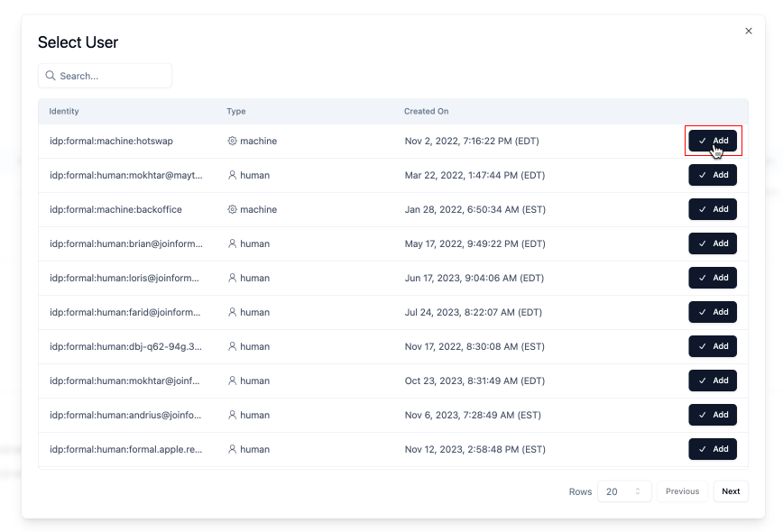Use for Formal UsersorUse for Formal Groups, select the desired Formal User or Group by clicking on the input and clicking onaddnext to the desired Formal User or Group.